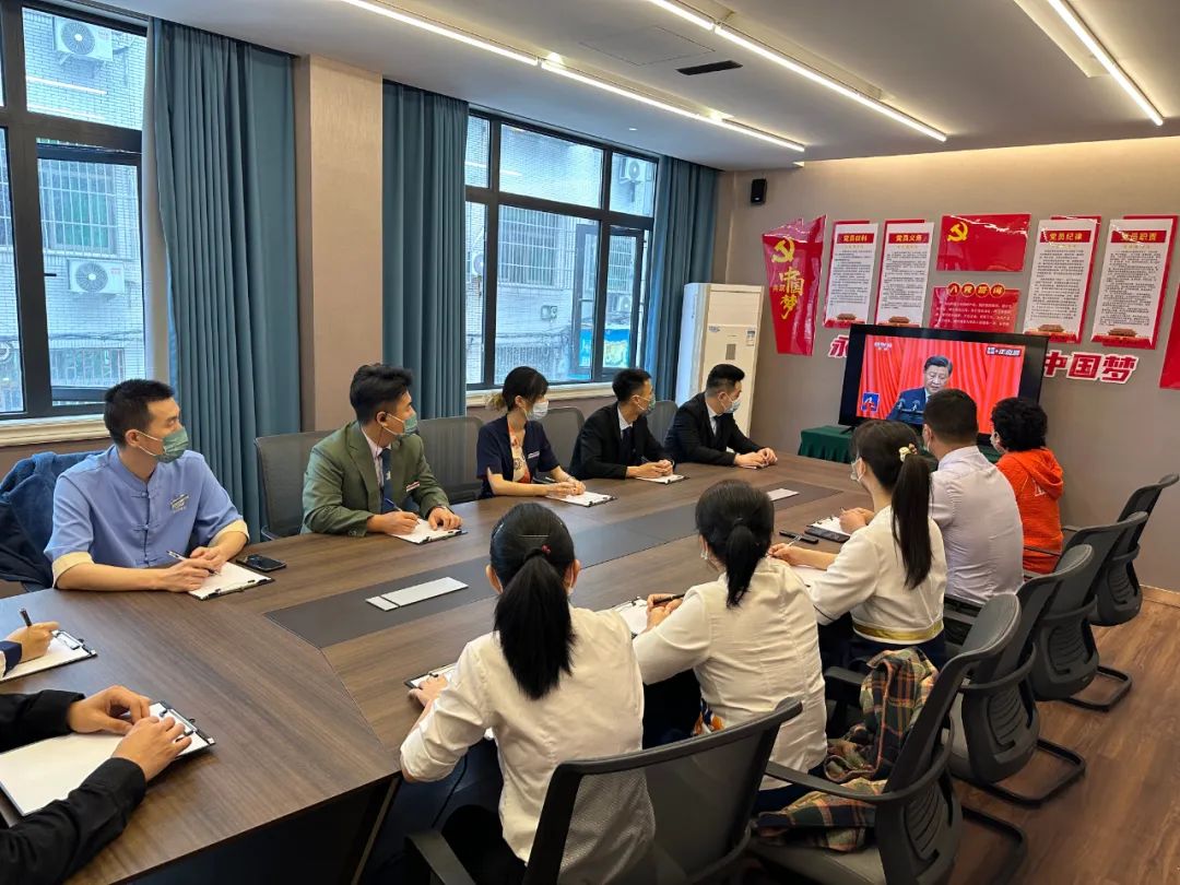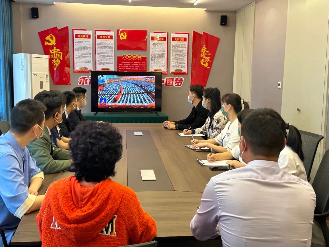 浙江省足疗沐浴养生行业协会沈美莲会长带领秘书处成员联合义乌阳光阿莲养生馆组织全体党员、预备党员、积极分子,在党建会议室集中观看了党的二十大开幕式。全体会员也在本协会的号召下响应防疫政策,坚守工作岗位,自行观看了开幕式直播。