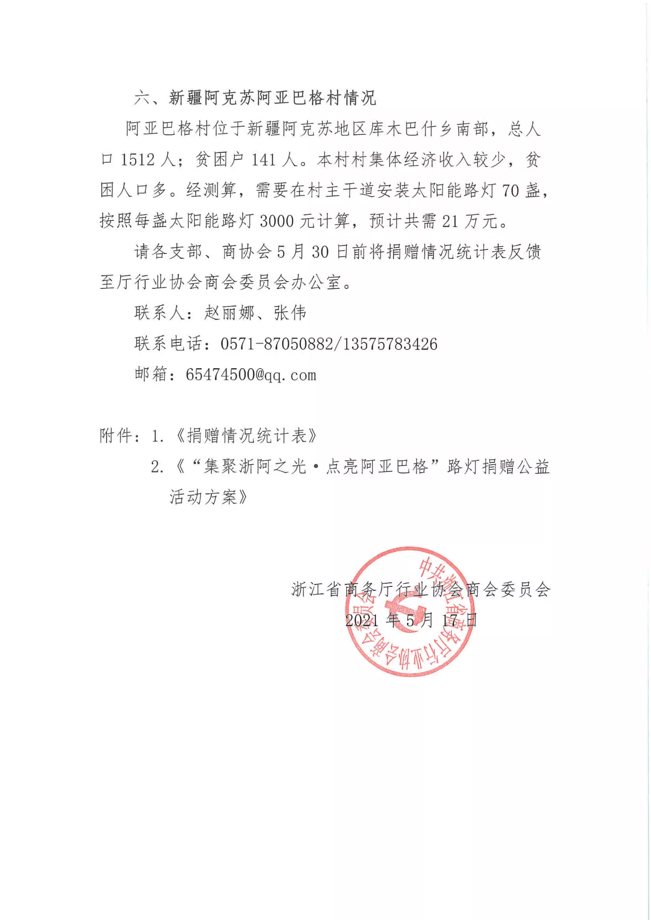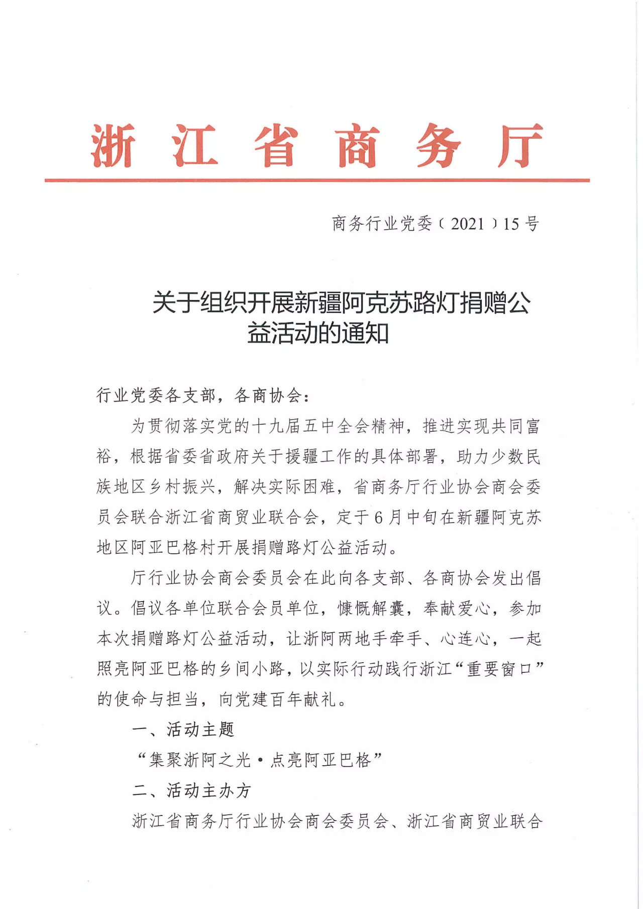 为助力新疆阿克苏地区乡村振兴和美丽乡村建设,切实解决村民困难,将浙江商贸人的爱心带到浙江对口支援的维吾尔族村落,照亮阿亚巴格村的乡间小路,点亮浙阿人民心中共同的梦想,以实际行动践行浙江“重要窗口”的使命与担当,向党建百年献礼。