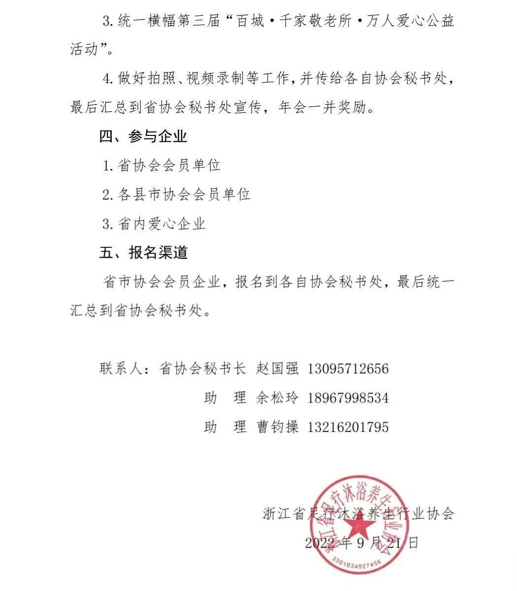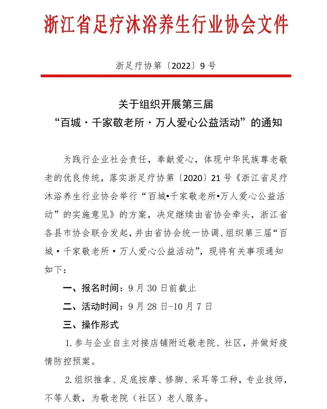 Double Ninth Festival为了体现取之于社会、奉献于社会,实现全民健康、共同富裕的伟大使命,献礼二十大,由省协会及杭州、宁波、温州、绍兴、嘉兴、衢州、金华、湖州、瑞安、乐清、苍南、萧山、富阳、桐庐、嵊州等省内各地协会联合发起,第三届“百城·千家敬老所·万人爱心公益活动”启动工作开始,详情见文件: