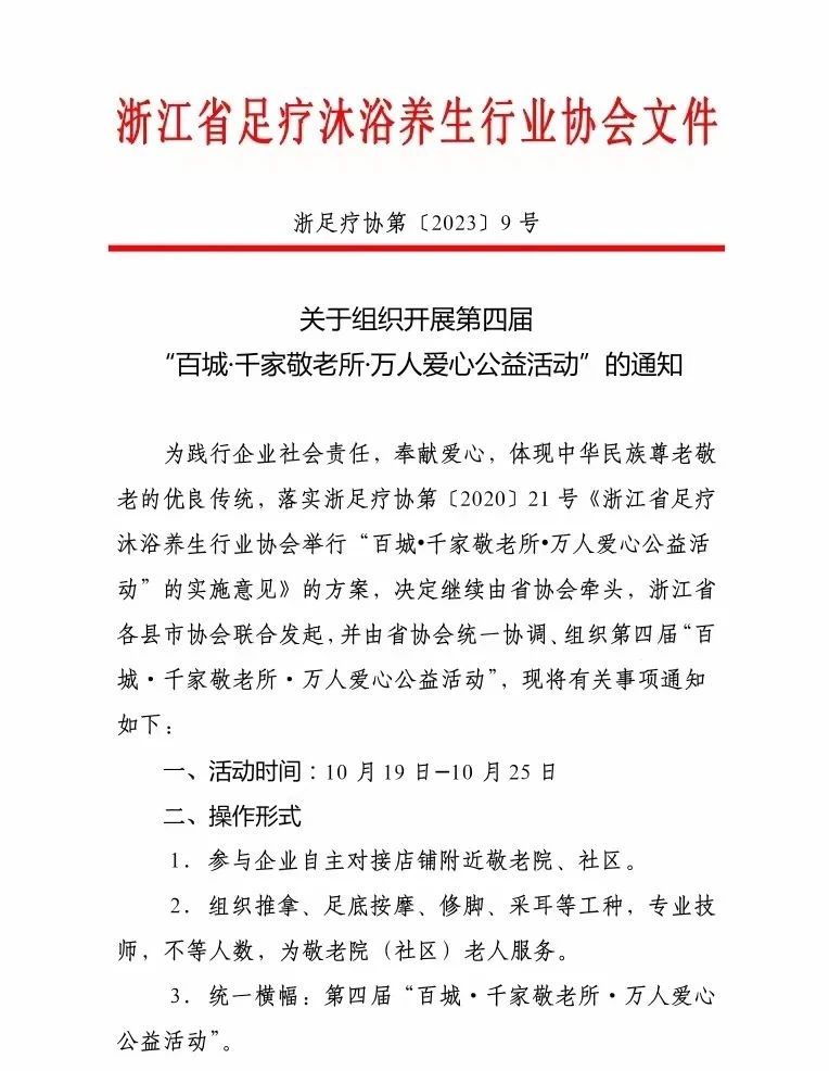 Double Ninth Festival为了体现取之于社会、奉献于社会,实现全民健康、共同富裕的伟大使命,由省协会及杭州、宁波、温州、绍兴、嘉兴、衢州、金华、湖州、瑞安、乐清、苍南、萧山、富阳、桐庐、嵊州等省内各地协会联合发起,第四届“百城·千家敬老所·万人爱心公益活动”启动工作开始,详情见文件: